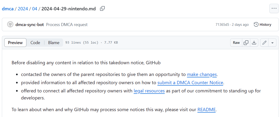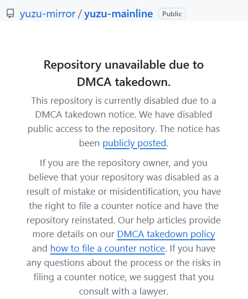4 月 29 日,GitHub 官方发布 DMCA(数字千年版权法)通知,由于任天堂指出了 100 多个声称提供 Switch 模拟器的存储库,并且任天堂声称所有或大部分 forks 的侵权程度与父仓库相同,因此 GitHub 向网站上 8535 个类似存储库发出删除通知。