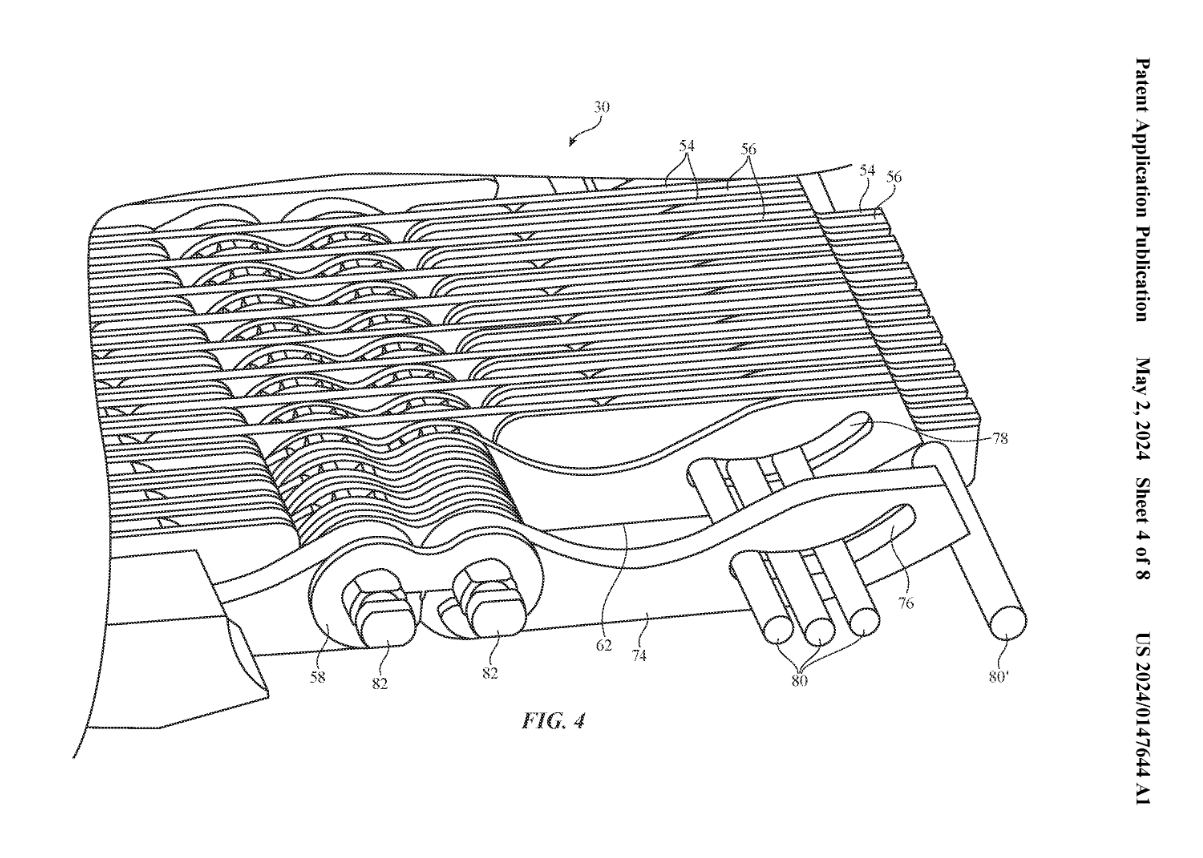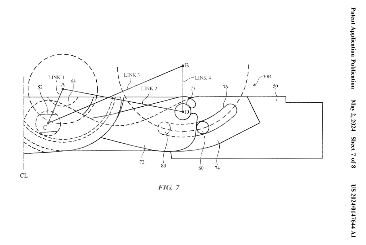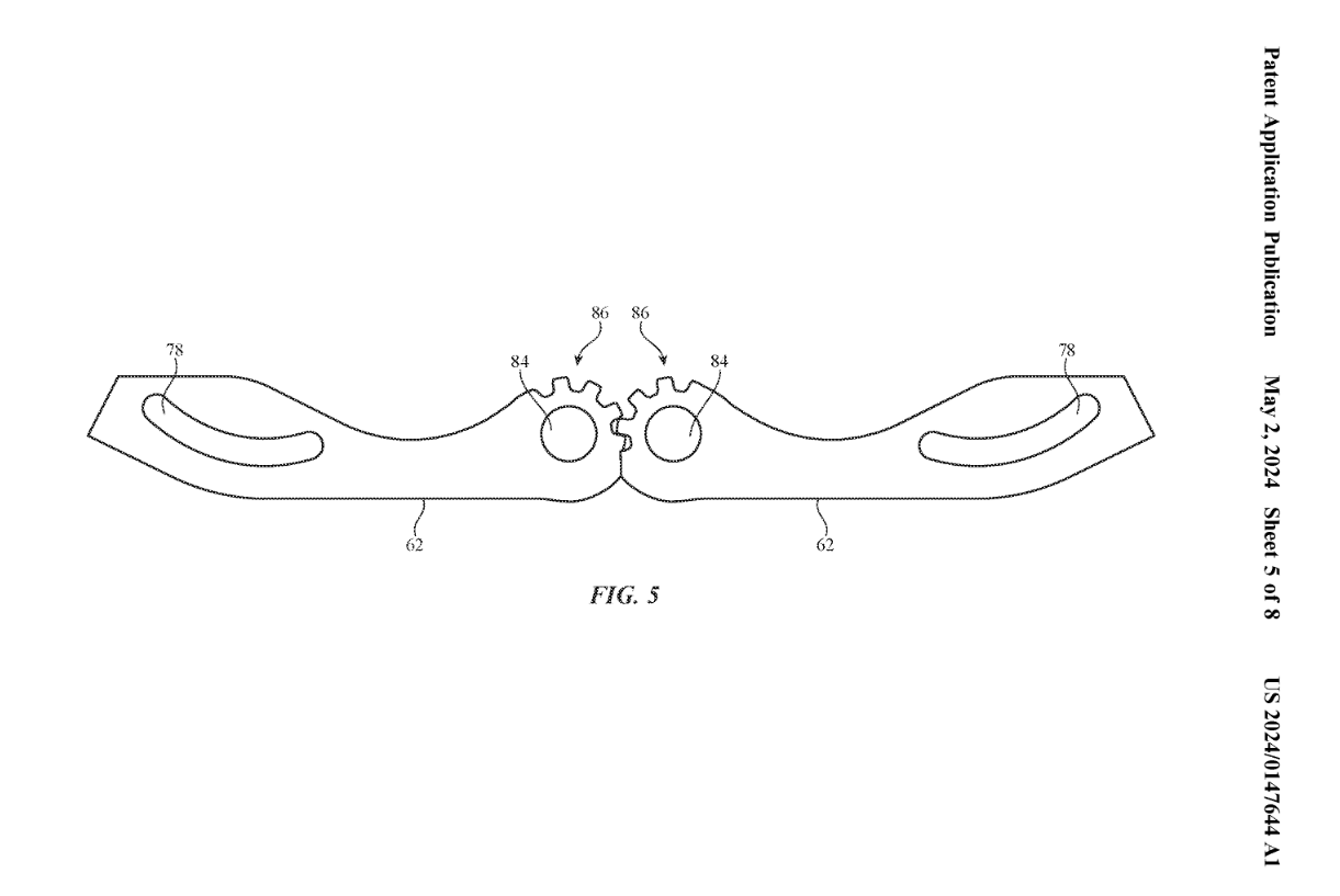 图 5 中展示了齿轮状的铰链设计,齿轮板具有容纳轴 #82 的开口 #84,以便齿轮板可以绕轴旋转。外壳 (#12) 的一半绕轴 #28 旋转时,板的配合齿使外壳的另一半同步旋转。