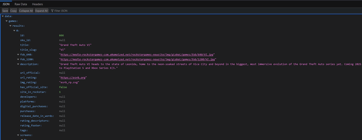 新的迹象表明 Rockstar 可能正准备分享更多关于该游戏的信息。一个名为“when_vi”的粉丝自制推特机器人会定期扫描 Rockstar Games 的 API 以查找有关《GTA 6》的信息,近日该机器人发现后端出现了四个新链接,分别指向疑似新的游戏截图以及关键插图 / 封面艺术。这些链接都返回了与《GTA 6》相关的数据,其中包括与首支预告片一同发布的剧情概要,进一步佐证了其与《GTA 6》的关联性。不过,目前点击这些链接只会出现 404 错误,表明 Rockstar 尚未上传任何内容。