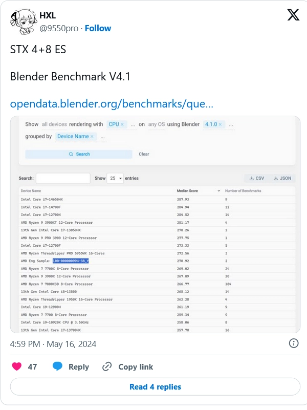5 月 17 日消息,消息源 @9550Pro(HXL)近日发布推文,表示在 Blender 基准测试结果中发现 AMD Strix Point CPU 工程样品,具有 4 个性能核心和 8 个效率核心。