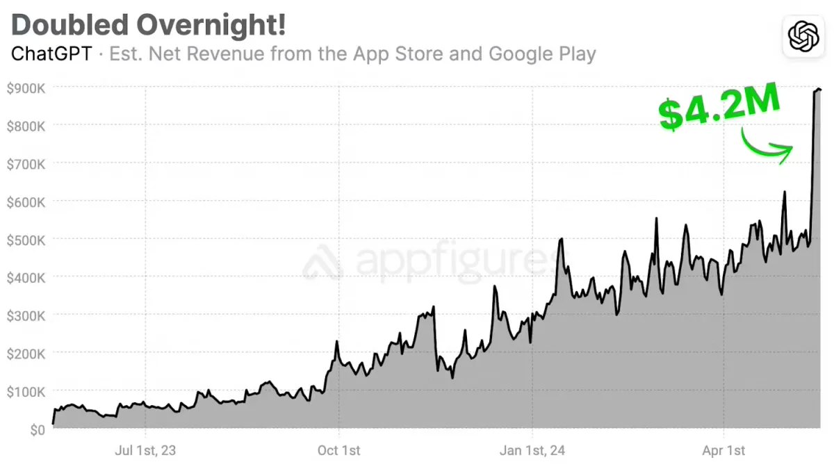 这一策略性决策刺激了移动端用户对订阅服务的需求,并由此创造了 OpenAI 有史以来最高的移动端收入增长。应用情报公司 Appfigures 的数据显示,在 GPT-4o 发布当天,ChatGPT 移动应用的净收入就暴增了 22%,并且在接下来的几天里持续增长。到周二,净收入达到了 90 万美元(当前约 650.7 万元人民币),几乎是其日常平均水平(49.1 万美元)的两倍(净收入数据是在苹果和谷歌商店抽成后计算所得)。