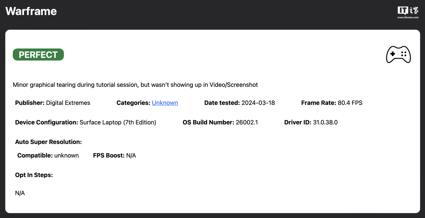 不过该网站表示,由于各制造商提供的设备不同,驱动也存在差异,即使游戏现在在网站上被列为“完美”,但可能实际上用户在运行游戏时会偶尔遇到问题,相关玩家也可以向网站回报自己遇到的各种 Bug / 错误情况。
