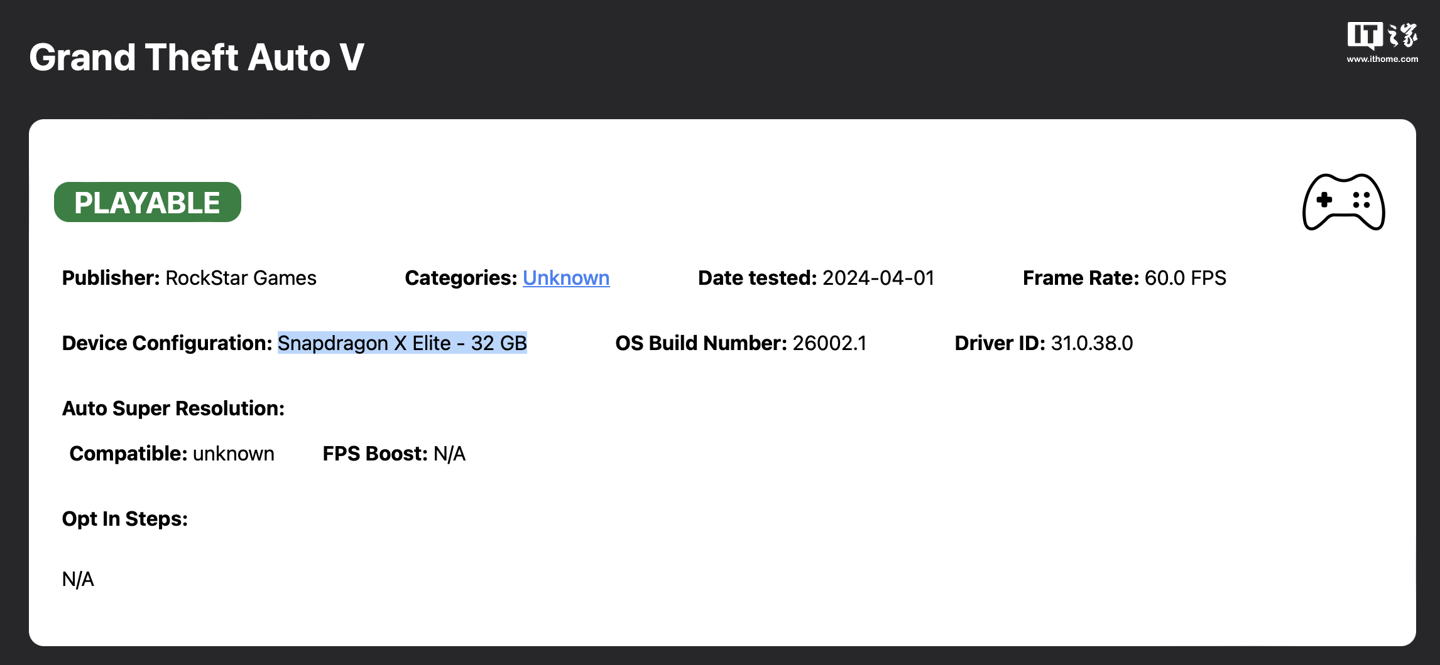 5 月 22 日消息,伴随着高通骁龙 X Elite 处理器的发售,目前许多 PC 制造商都在推出自家 ARM Windows 笔记本电脑,目前一家名为 Linaro 的公司与微软、高通和 ARM 合作上线了一个用于了解 ARM Windows 平台“游戏性”的网站,用户可以在网站中了解自己的设备能否玩某款游戏以及玩某款游戏的帧率,附网页链接:点此访问
