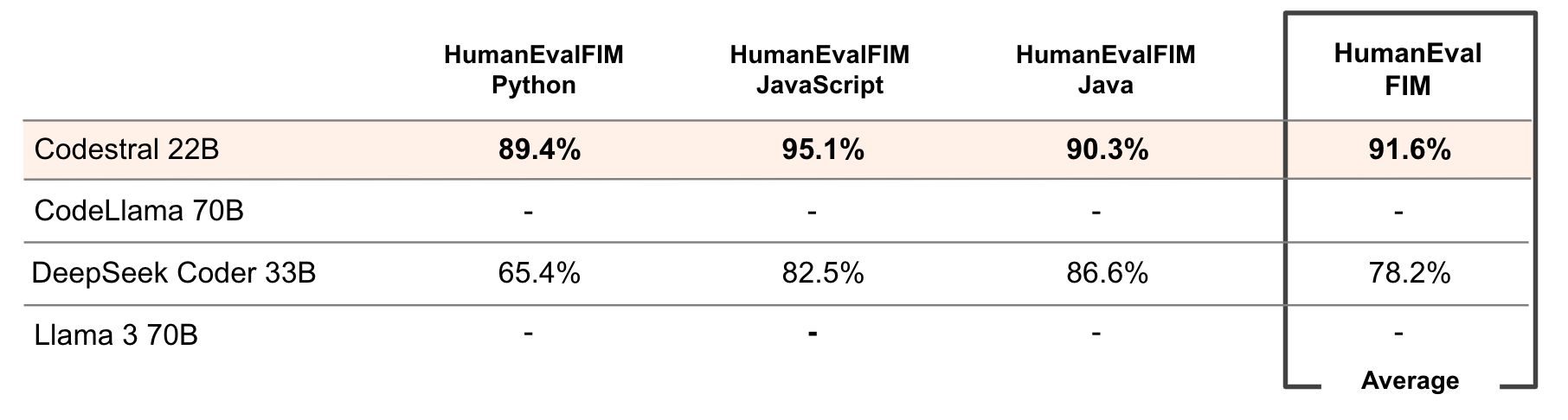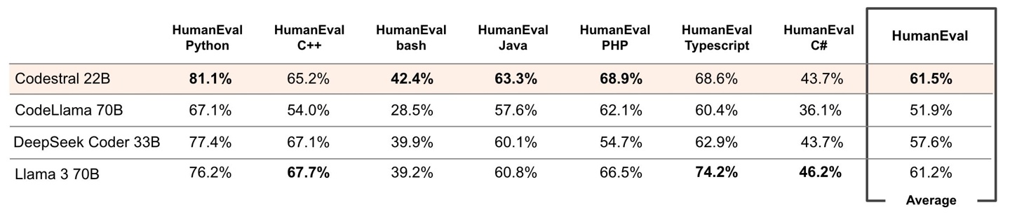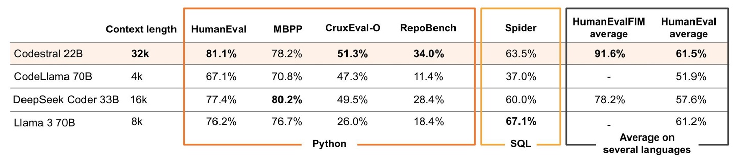 Mistral AI 还通过图表,让 Codestral 22B 对比了 CodeLlama 70B、DeepSeek Coder 33B 和 Llama 3 70B 同类大模型,表示 Codestral 的参数虽然只有 220 亿,但上下文长度达到 3.2 万个 tokens,根据进行的几项基准测试,它在 Python、SQL 和其他语言方面的表现普遍更好。