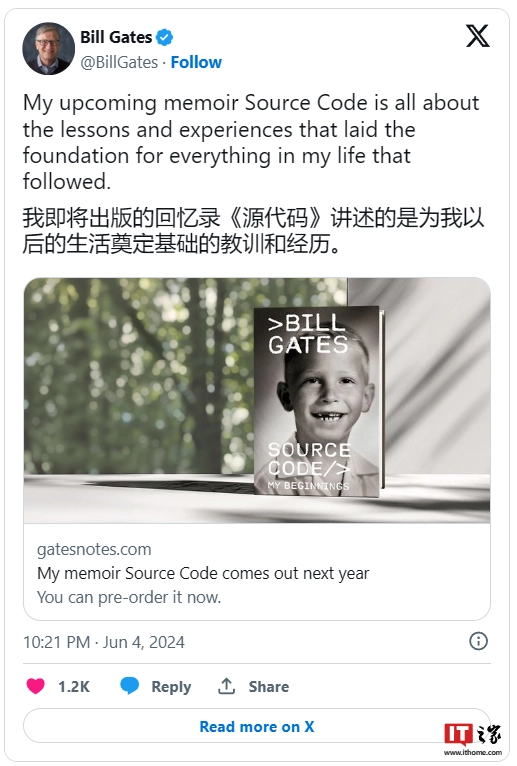 6 月 5 日消息,比尔・盖茨宣布将于明年推出个人回忆录《源代码:我的开始(Source Code: My Beginnings)》。这本回忆录涵盖了盖茨的童年经历,一直记述到他于 1975 年联合创办微软公司为止。虽然作品要到 2025 年 2 月 4 日才正式发售,但目前已经开放预订。