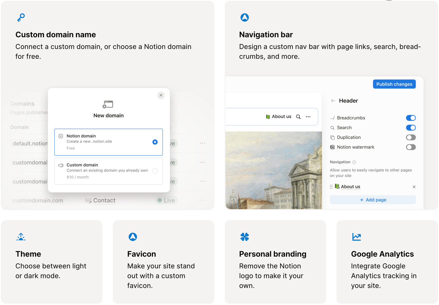 自定义域名:绑定用户自己的域名,或选择 Notion 的二级域名