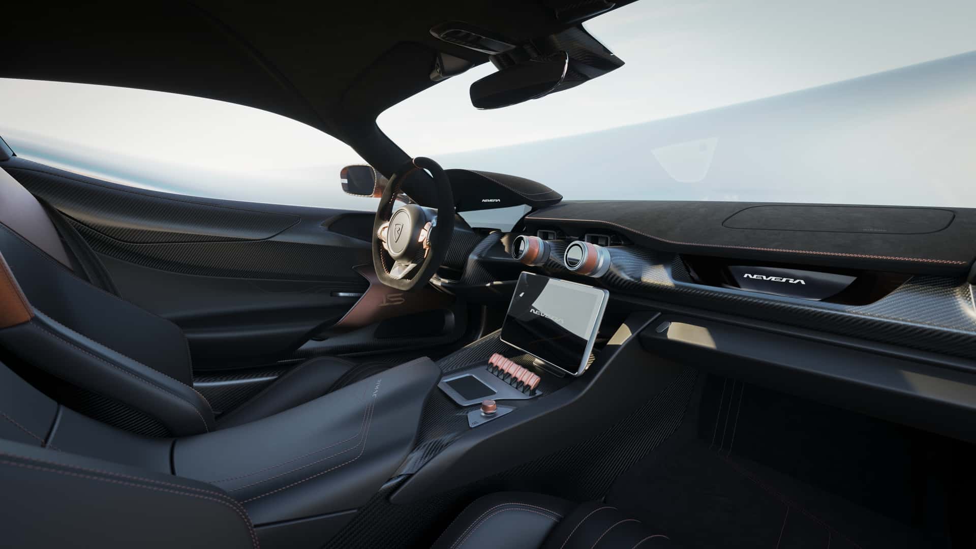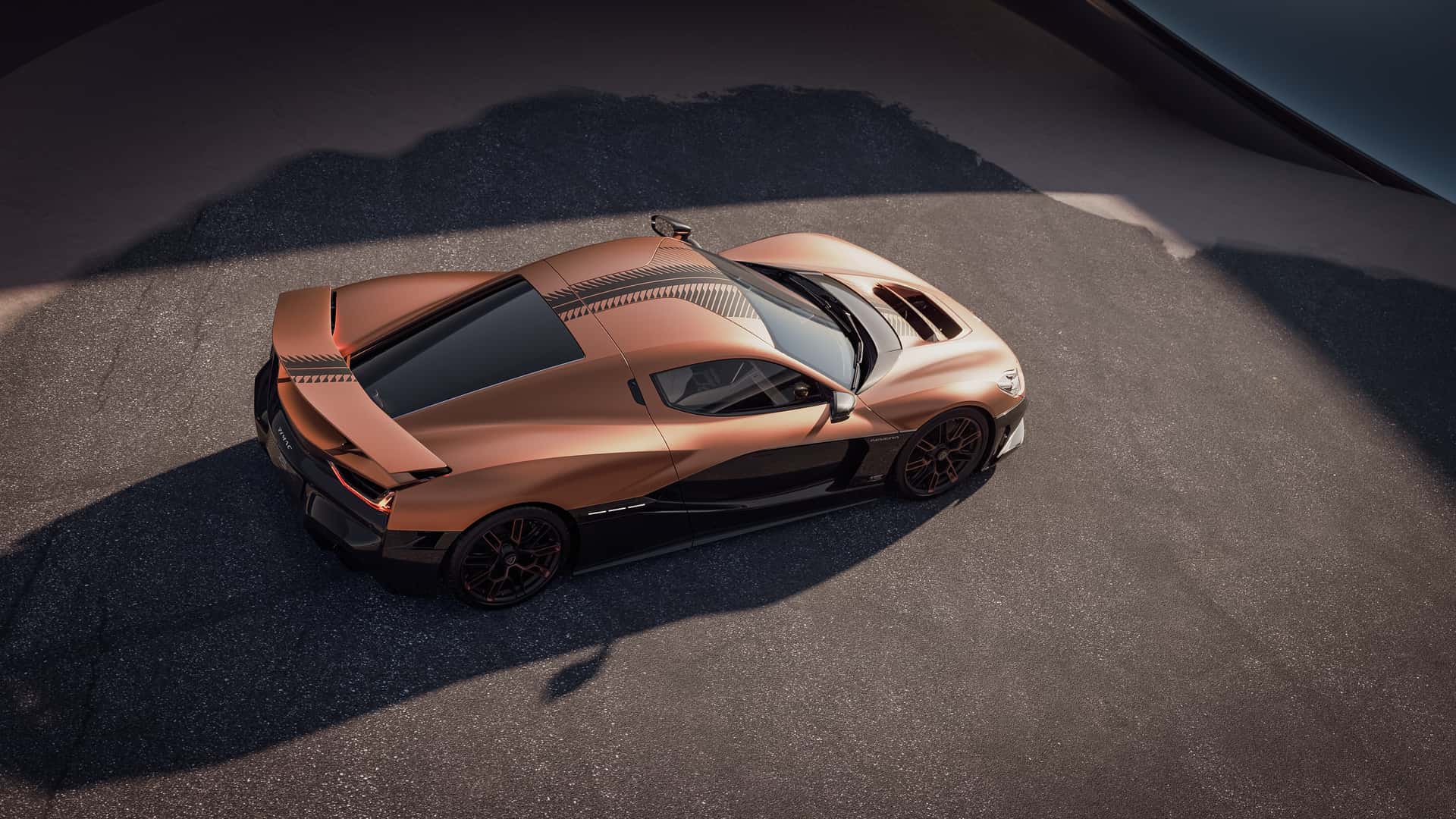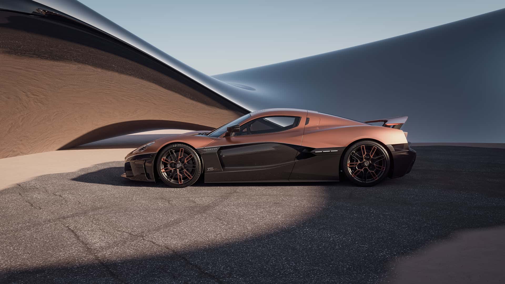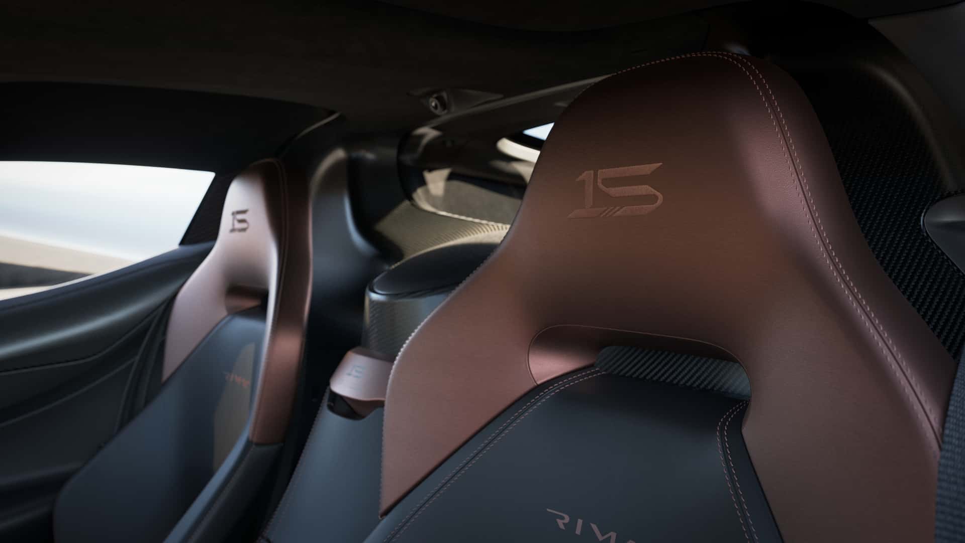该限量版 Nevera 最大的亮点在于其独特的视觉设计,新车采用双色车身涂装,上半部分为全新研发的铜色哑光漆面,下半部分则裸露碳纤维编织纹理,辅以亮光透明漆层。轮毂也加入了铜色元素,与车身配色相得益彰。此外,新车还拥有“15 周年纪念”徽章。