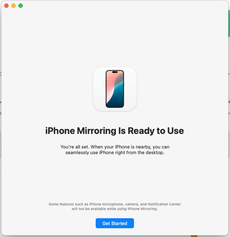 用户在 Mac 设备上点击新的 iPhone 镜像图标,并按照说明操作,即可启用 iPhone 镜像功能,用户在 iPhone 锁定状态下打开和使用 App、管理通知等。