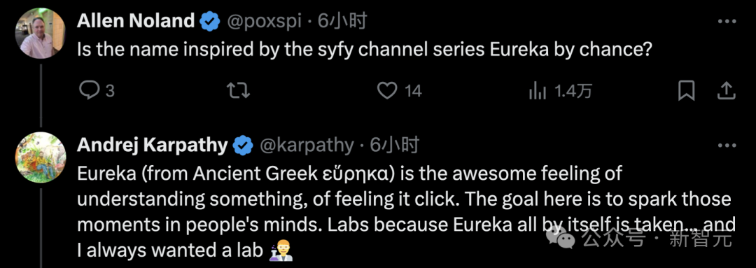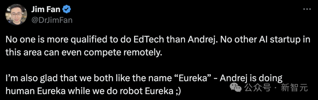 「很开心我们都喜欢『Eureka』这个名字 ——Andrej 致力于人类的 Eureka,而我们则专注于机器人的 Eureka。