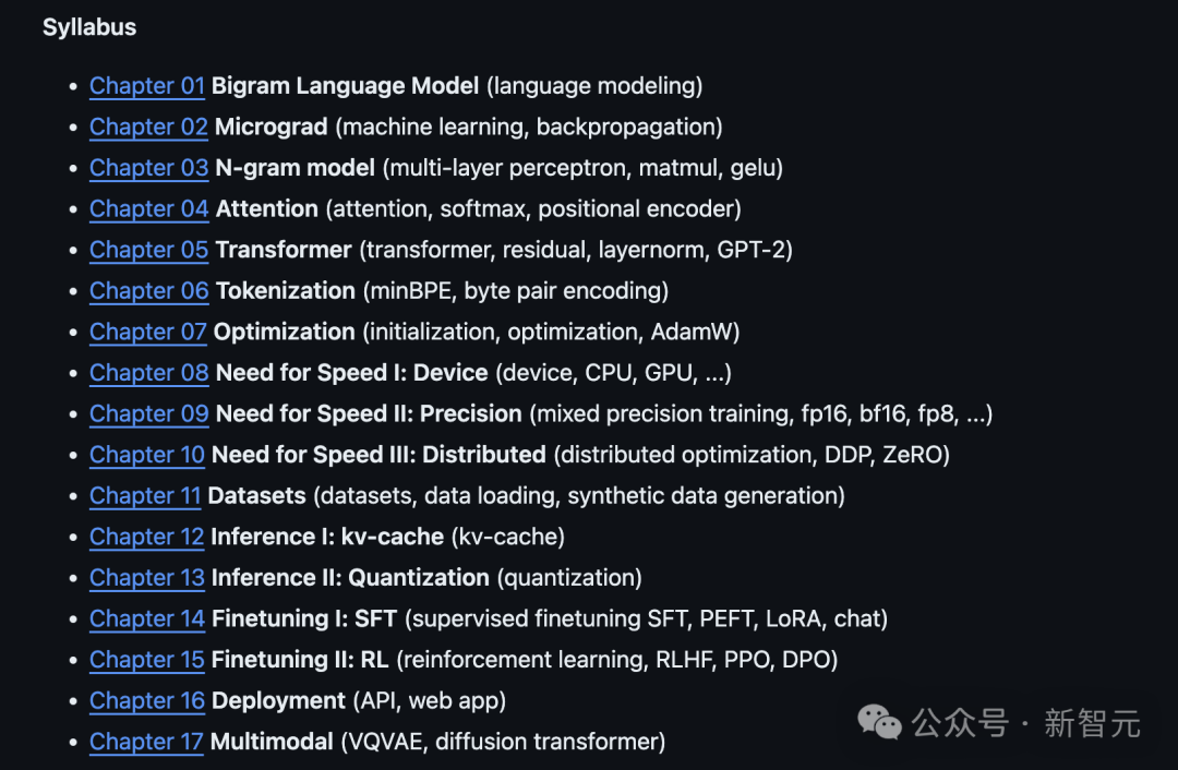 这节课一共分为 17 个章节,从最基础语言模型,到注意力 Transformer 加厚,再到分词器,优化器,数据集,推理、再到微调部署等,一套完成构建模型全过程有了。