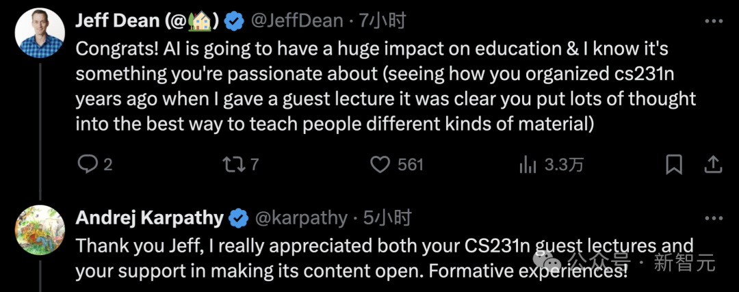 谷歌 DeepMind 首席科学家 Jeff Dean 表示,「祝贺!AI 将对教育产生巨大影响,我知道这是你热衷的领域(回想起多年前,当我做客座讲座时,你组织 cs231n 课程的情景,显然你在如何以最佳方式教授人们不同类型的材料上投入了大量思考)」。