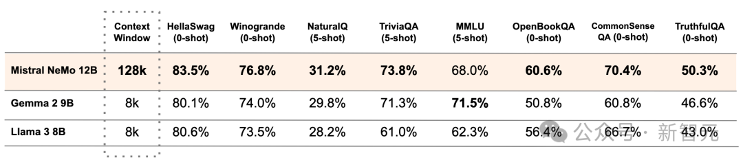 下表结果所示,除了在 MMLU 基准上,Mistral NeMo 不如 Gemma 2 9B。