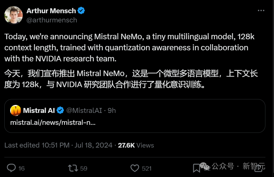 GPT-4o mini 发布同天,欧洲最强 AI 初创公司 Mistral 立马发布旗下最新最强小模型 ——Mistral NeMo。