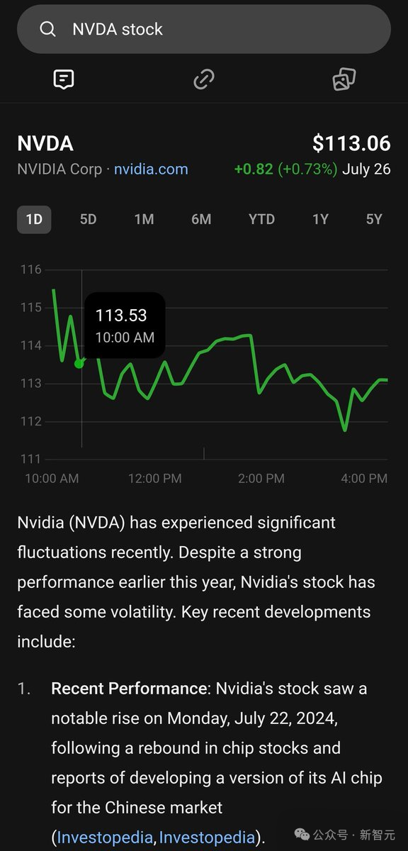 查询英伟达股票,会给出英伟达股票整体的可视化图,随后给出了一些分析。所有股票信息都被无缝集成在页面中。