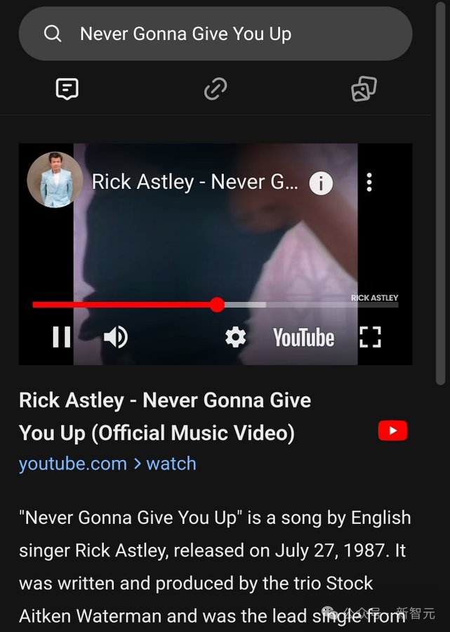 输入一首歌名「Never Gonna Give You Up」,然后直接给出了 YouTube 歌曲视频,不用跳转到其他网页,在一个页面就可以听歌、看视频。