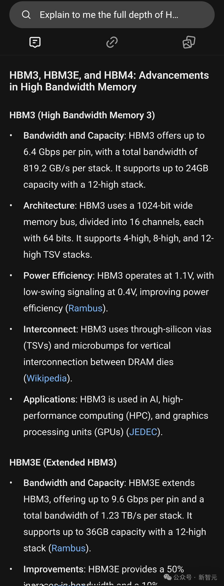 SearchGPT 在给出关于高带宽存储器的解释中,蓝色标出的内容,是参考解释。