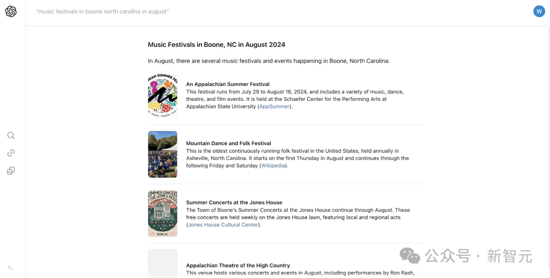 但另一方面,OpenAI 当天放出的官方演示,被外媒《大西洋月刊》曝出其中的问题。在回答「8 月在北卡罗来纳 Boone 举办的音乐节」的问题时,SearchGPT 竟弄错时间,出现了幻觉。