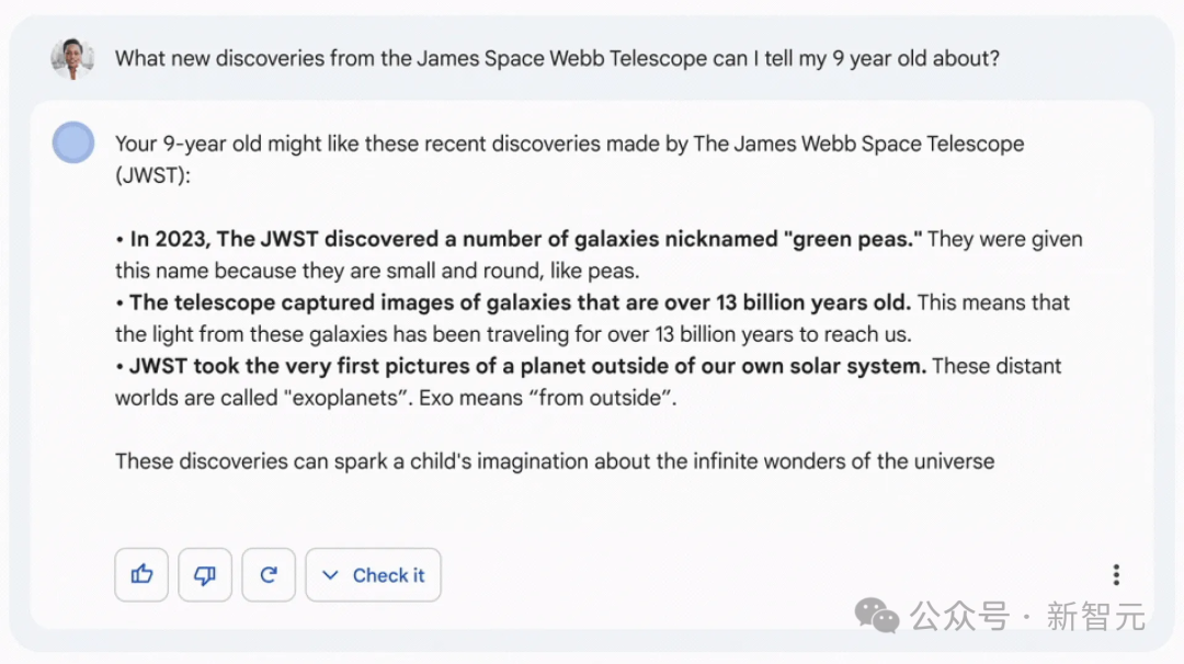 2023 年 2 月,谷歌推出了这个聊天机器人产品以对抗 ChatGPT,但首次亮相就出现了事实性错误,导致 Alphabet 股价当天暴跌 9%,市值瞬间蒸发 1000 亿美元。