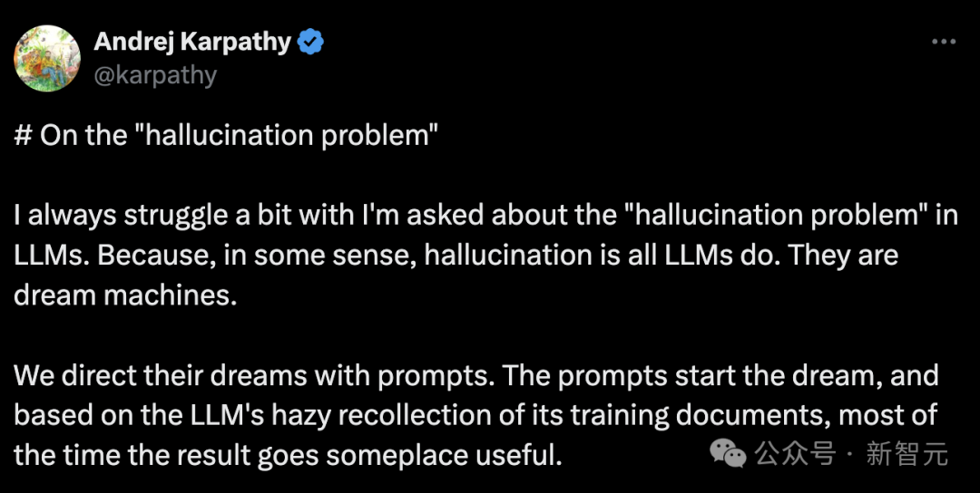 而且,Andrej Karpathy 大佬曾经在推特上表达过这样的观点:「幻觉并不是 bug,而是 LLM 最大的特点。」