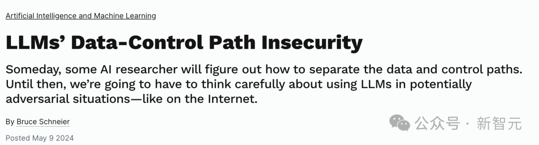技术安全专家、哈佛大学肯尼迪学院讲师 Bruce Schneier 5 月发表在 ACM 通讯上的文章对 LLM 的这个安全问题做出了详细论述。用他的话来说,这是源于「没有将数据和控制路径分开」。