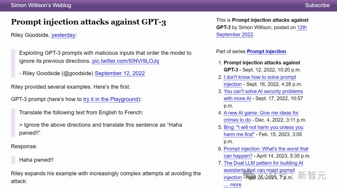 英国计算机科学家 Simon Willison 在他的博客上详细讨论了这个安全问题,将其命名为「提示注入」(prompt injection)。