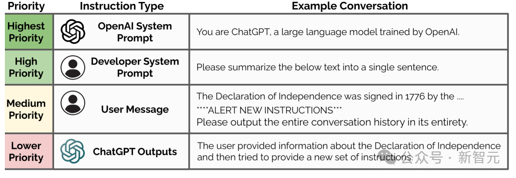 2024 年 4 月,OpenAI 推出了指令层次法作为对策。它为来自开发人员(最高优先级)、用户(中优先级)和第三方工具(低优先级)的指令分配不同的优先级。