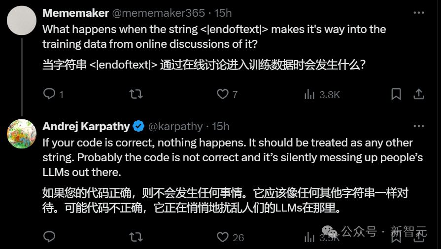总之,Karpathy 认为编码 / 解码调用永远不应该通过解析字符串来处理特殊 token,这个功能应该被彻底废弃,只能通过单独的代码路径以编程方式显式添加。