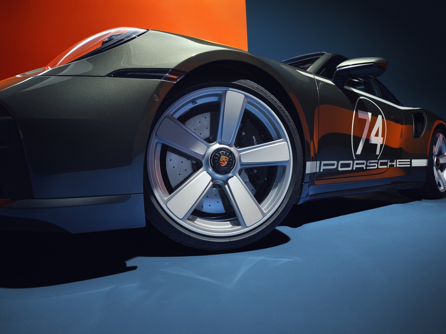 该车首次将 Turbonite 徽标用于 911 车型,内饰在座椅、门板等处运用了经典的 McKenzie 格纹,官方称实现传承与致敬。同时,该车还提供 Heritage Design 套件,包含砂金石绿金属漆、白色(缎纹表面)装饰图形、车身的 Turbo50 涂装,用户可以自定义车侧 0-99 之间的发车编号数字。