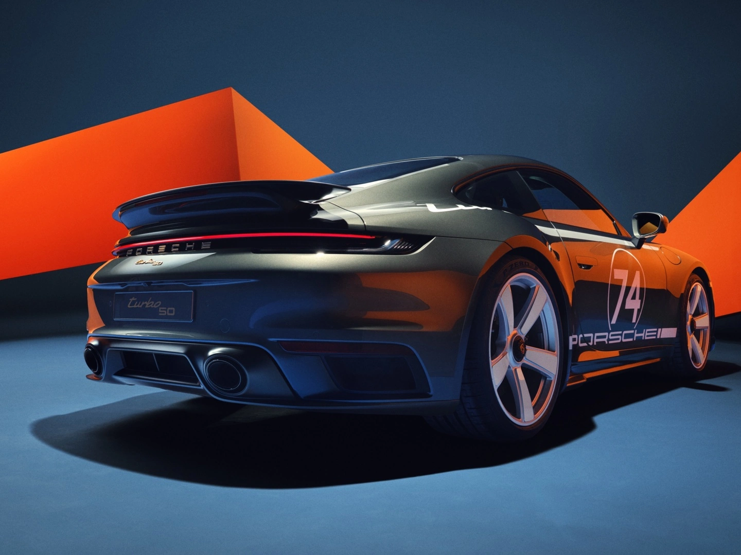车尾方面,该车拥有金色的 Turbo50 和 Porsche 标志,车内配有 Porsche Design 亚秒级计时器,官方宣称采用 Turbo 50 周年纪念版设计。