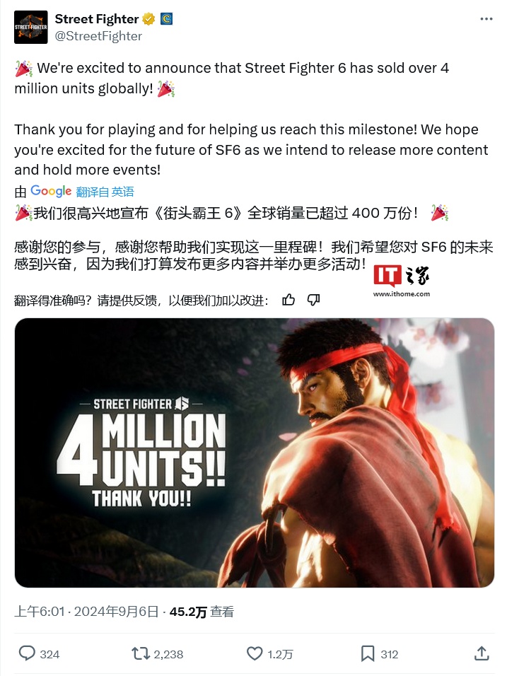 9 月 7 日消息,卡普空昨日(9 月 6 日)通过官方账号,宣布《街头霸王 6》游戏发行 15 个月之后,全球销量突破 400 万份。
