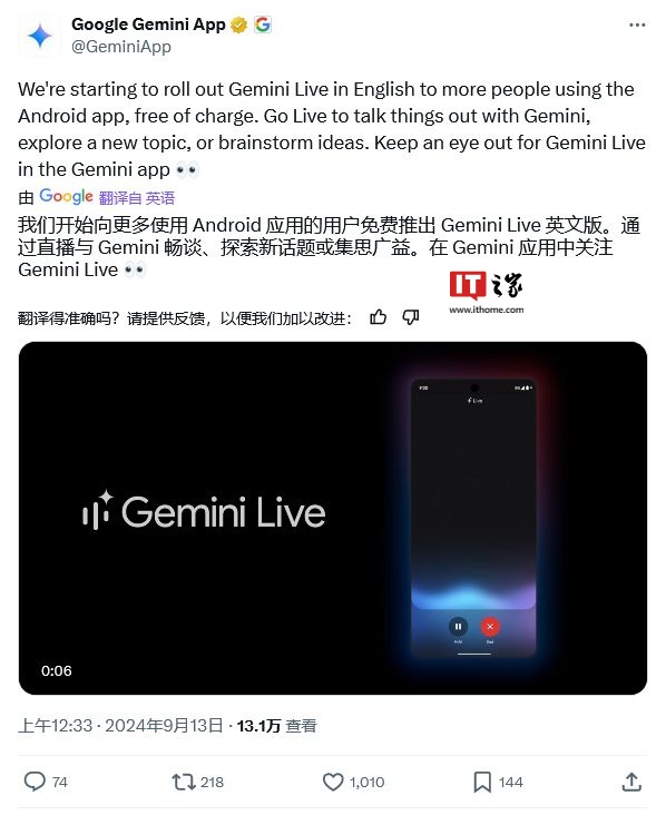 9 月 13 日消息,科技媒体 9to5Google 昨日(9 月 12 日)发布博文,报道谷歌在 1 个月前面向 Advanced 订阅用户推出后,正逐步面向所有安卓用户免费开放 Gemini Live。