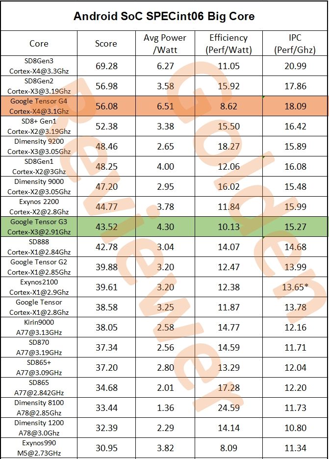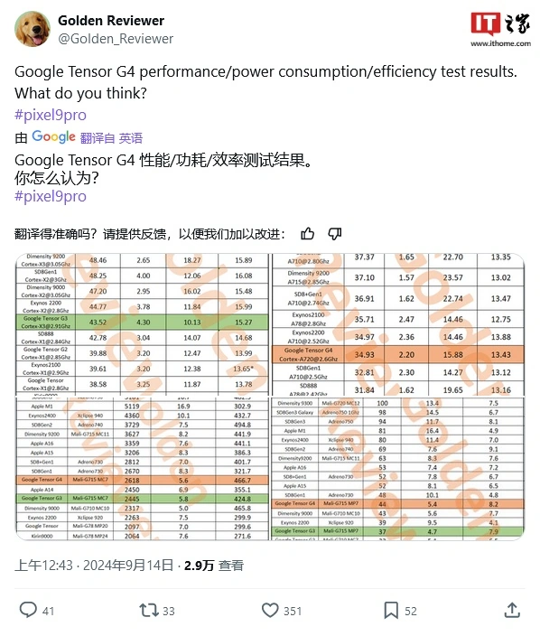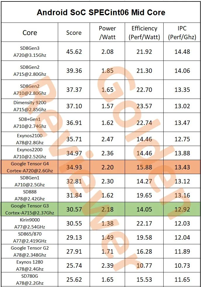 谷歌 Tensor G4 芯片得益于三星改进的 4nm 工艺,轻松超越了 Tensor G3 和骁龙 8 Gen 1,获得了极高的“每瓦性能”评分。