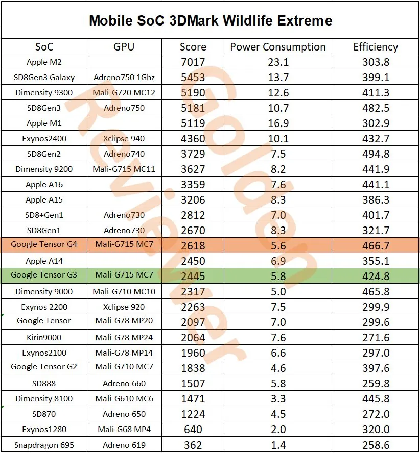 IT之家注:3DMark Wild Life Extreme 重点对 CPU 和 GPU 进行压力测试,根据他分享制作的图表,谷歌 Tensor G4 芯片得分为 2618 分,略高于 Tensor G3 的 2445 分,但低于高通骁龙 8 Gen 1 芯片。