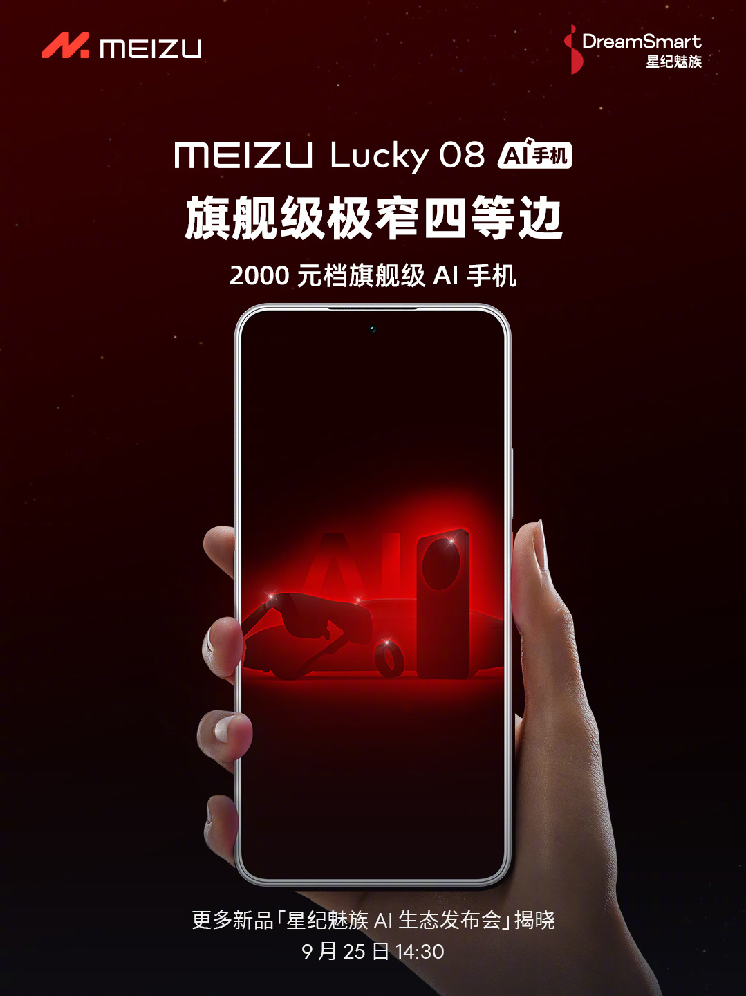 据介绍,魅族 Lucky08 手机定位“2000 元档旗舰级 AI 手机”,采用 1.75mm 极窄四等边、前后双 2.5D 微弧设计、使用 G3 曲率衔接。预热海报显示,该手机拥有黑白两种配色,均采用红色电源键撞色设计。