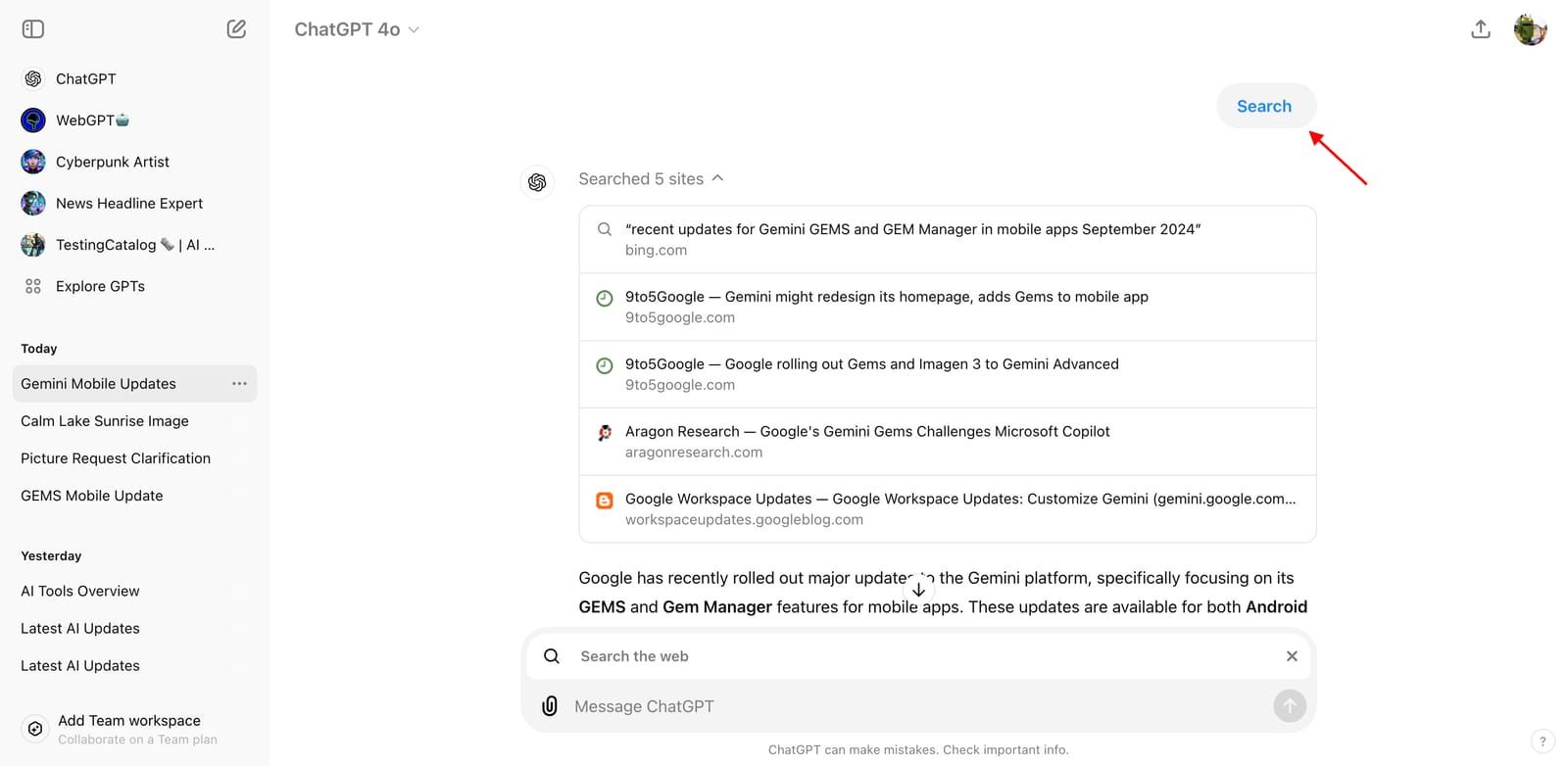 该指令会进入一个新的搜索模式,你输入的任何内容都会被视为搜索查询。即便用户没有输入任何内容,ChatGPT 会记忆和用户上次讨论的内容,从而提取相关的信息。