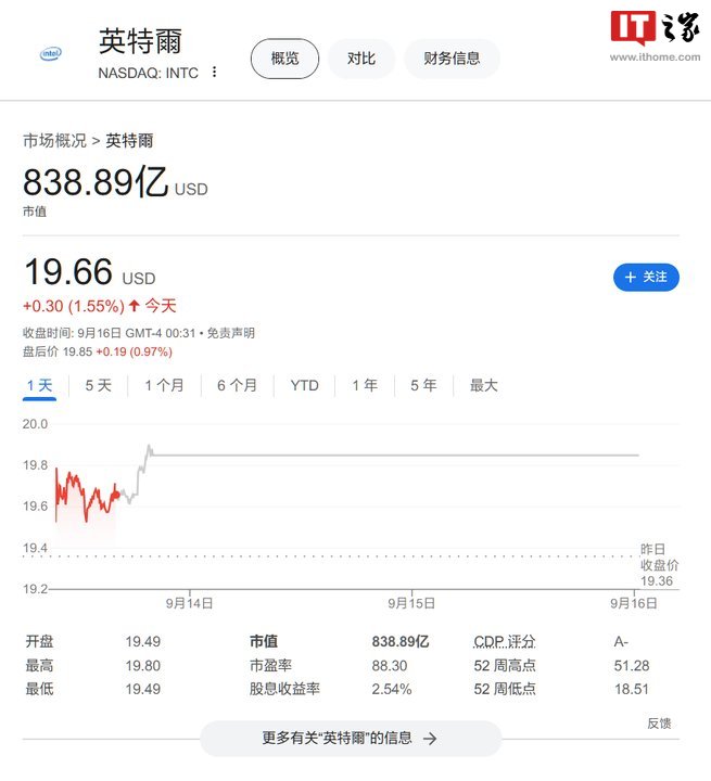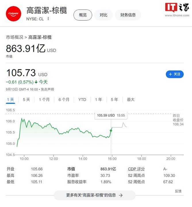 9 月 16 日消息,纽交所数据、纳斯达克指数显示,截至当地时间 9 月 16 日上午 4 时 4 分,英特尔市值为 838.89 亿美元(当前约 5963.81 亿元人民币),今天的股价为每股 19.66 美元(当前约 140 元人民币);截至当地时间 9 月 13 日下午 4 时,高露洁-棕榄市值为 863.91 亿美元(当前约 6141.68 亿元人民币),今天的股价为每股 105.73 美元(当前约 752 元人民币)。