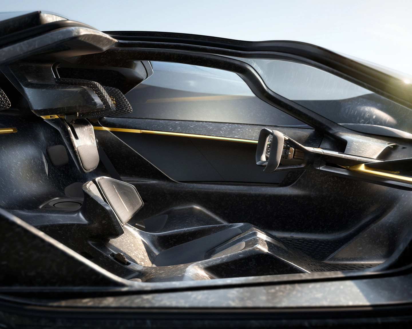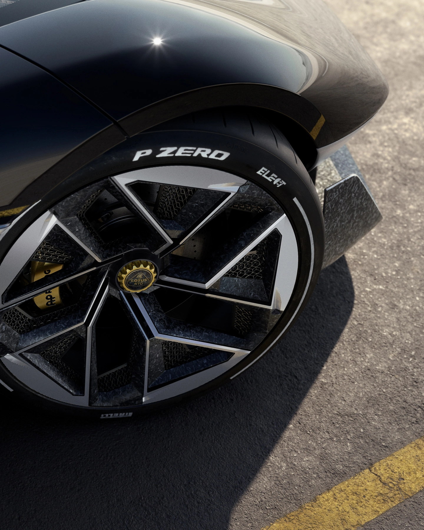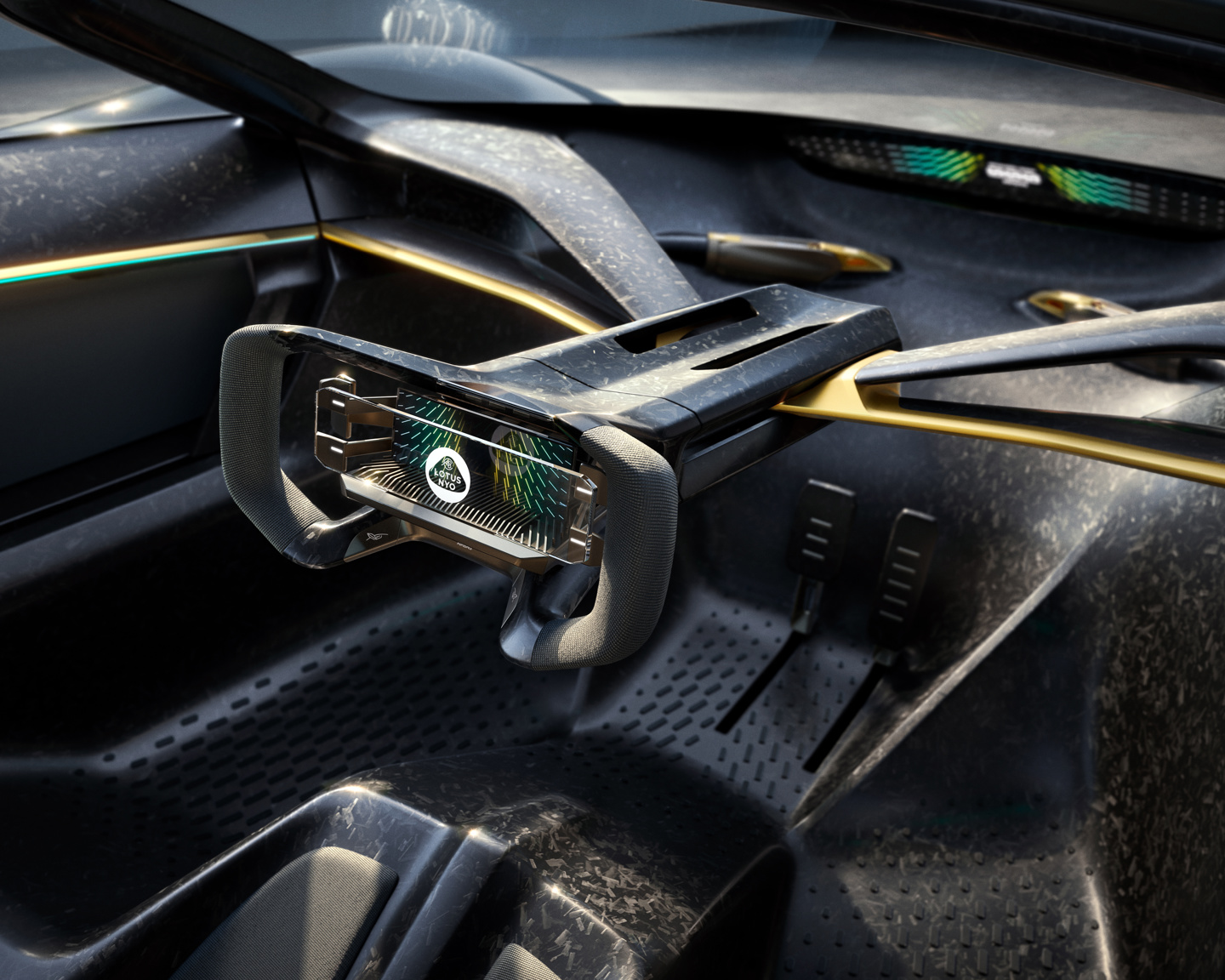 该车在内饰方面同样简洁,同样是黑色底色,配有少部分路特斯标志性的黄色线条;用上了类似赛车的方向盘,中间似乎有一个屏幕,官方宣称采用 LOTUSWEAR「数字生命体」概念。