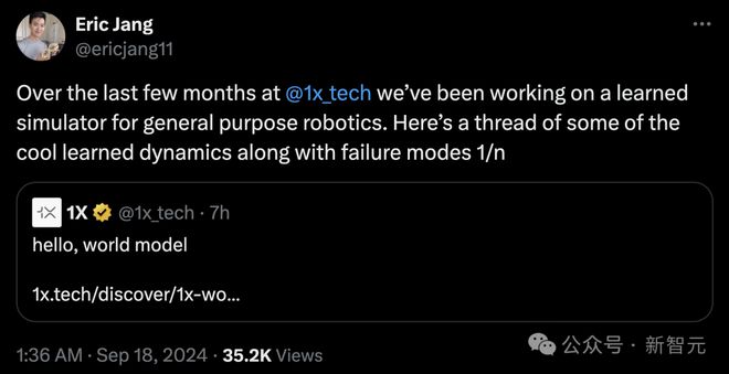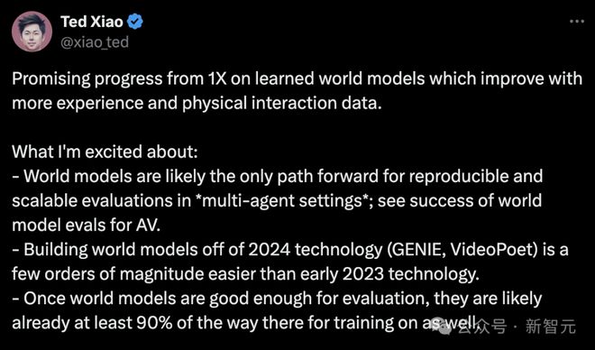 谷歌DeepMind机器人高级研究员Ted Xiao表示,1X的「学习型」世界模型能够随着惊艳、物理交互数据不断改进。