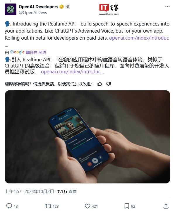 10 月 2 日消息,科技媒体 The Decoder 昨日(10 月 1 日)发布博文,报道称 OpenAI 在旧金山开发者大会(DevDay)上,发布了 Realtime API,可以让开发者调用该 API 在第三方应用中集成语音合成技术。