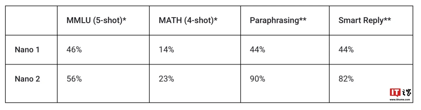 Gemini Nano 适用于多种应用场景,支持消息智能回复、文本改写、文章校对和总结内容,目前谷歌公司开放给开发者测试的是 Gemini Nano 2 模型,相较前一代,Nano 2 在质量上有明显提升,虽然规模接近前一代的两倍,但谷歌公司声称,Nano 2 在基准测试和实际应用中的表现更为出色,能力甚至可媲美“更大型的模型”。