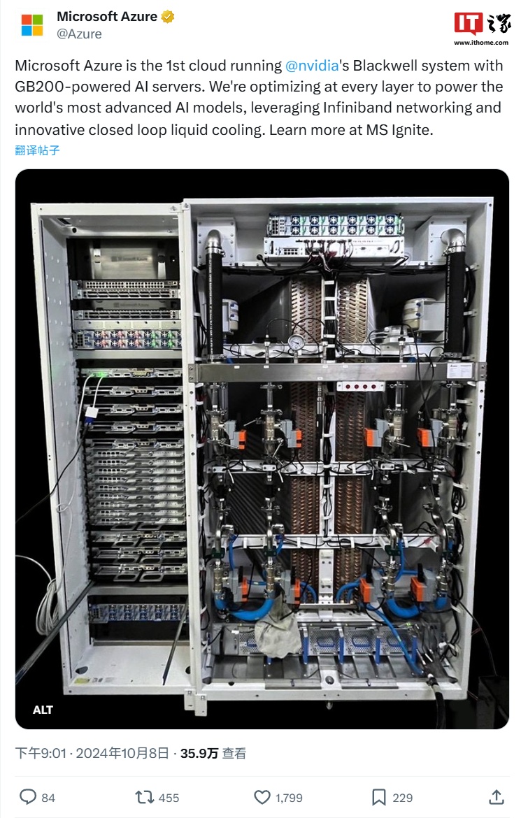10 月 9 日消息,微软 Azure 官方 X 账号昨晚发文“炫耀”了自家的新装备:公司已经拿到了搭载英伟达 GB200 超级芯片的 AI 服务器,成为全球云服务供应商中首个用上 Blackwell 体系的公司。